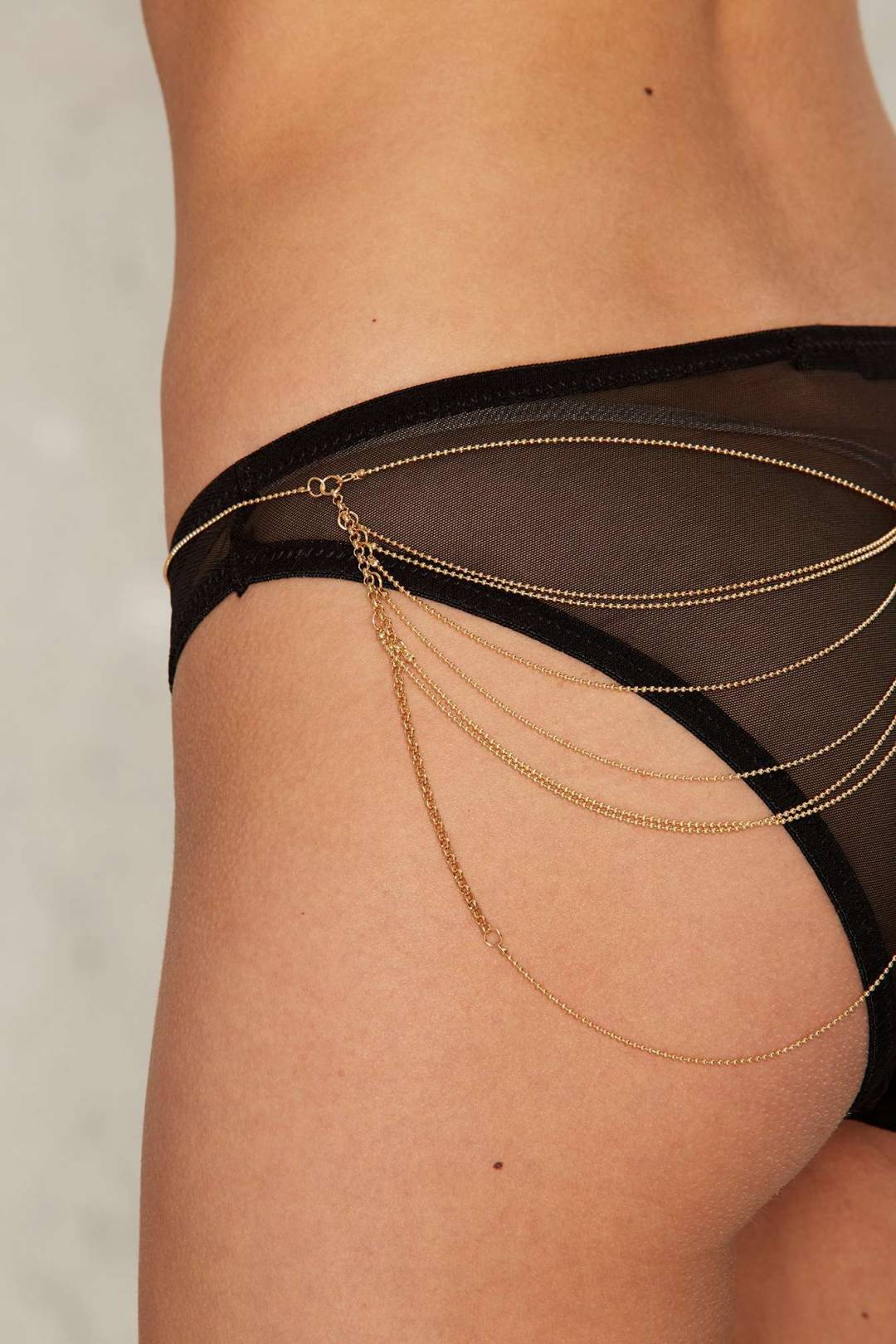 Kis fémláncok, amelyek megmozgatják a képzeletet. Kiegészítő, amely érzéki megjelenést kölcsönöz a hálószobán kívül és belül egyaránt. A deréklánc követi és kiemeli a fenék vonalait.